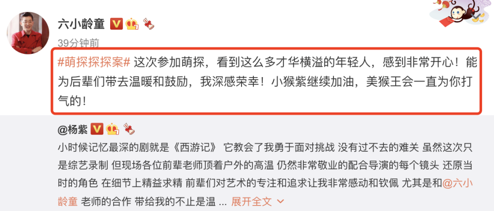 杨紫特意艾特了六小龄童老师,称对方带给自己的不止是温暖的鼓励,也让她更明白演员的责任,经典的作品值得永远流传下去,前辈们的鼓励她也会一直铭记在心。