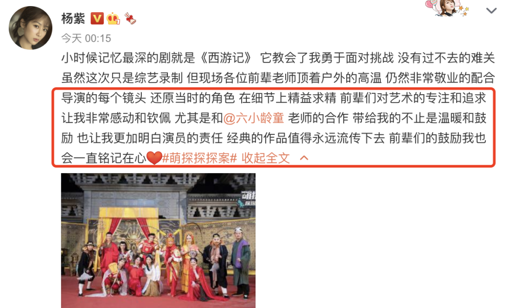 6月26日零点多,杨紫分享了大合照谈《西游记》给自己带来的感悟,同时也致敬前辈六小龄童。
