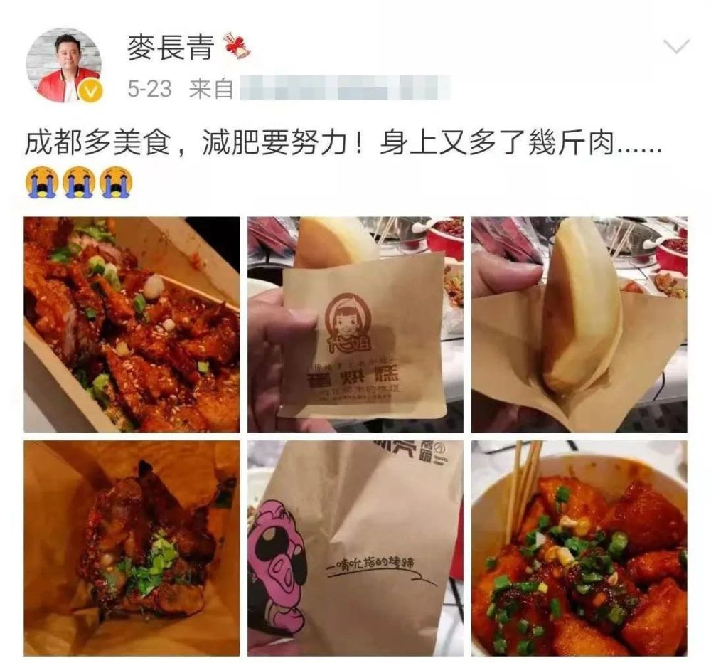 比如他飞去成都,工作之余还不忘去当地品尝美食。