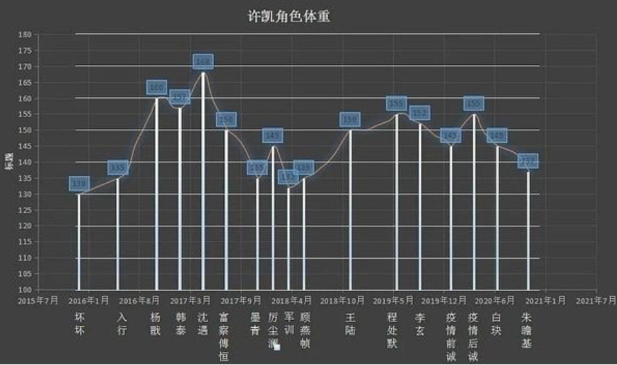有家里养熊猫的粉丝,为了提醒许凯控制体重,专门做了soso体重折线图。
