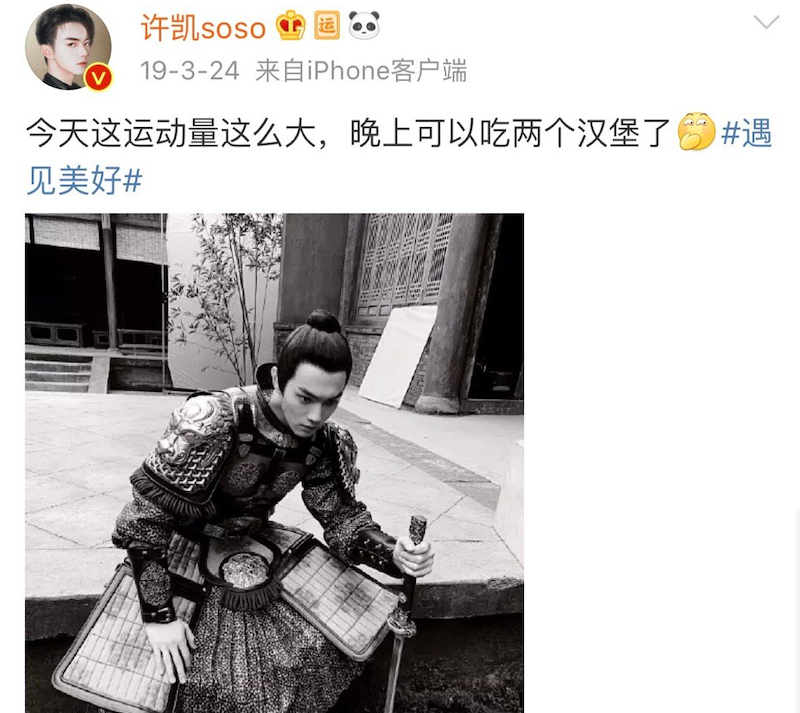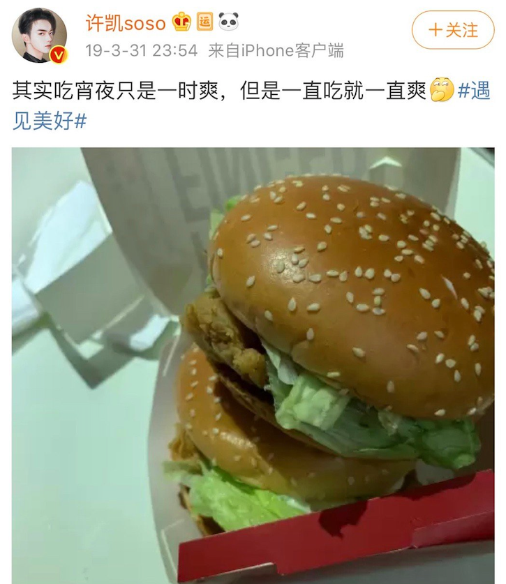 许凯一个晚上能吃三顿夜宵,两顿烧烤+两个汉堡。