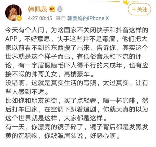 网红韩美娟可以怼天怼地,因为没人在意网红说什么,但艺人韩佩泉出现的时候,面临的受众群体就不一样了,所谓的公众人物,确实要时刻注意自己的言行。