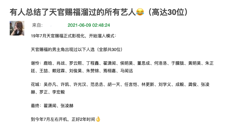 每一部大火的作品都难以避免被影视化的“宿命”,《天官赐福》也不例外,自从传出要影视化的消息后,演员名单早早就传了一长串,从鹿晗吴亦凡到焉栩嘉范丞丞,长达两年的遛粉之后,终于在最近,疑似尘最终出演人选尘埃落定——翟潇闻、张凌赫。