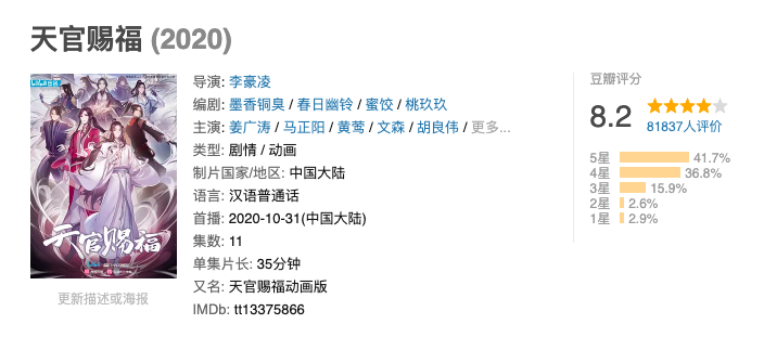 继《魔道祖师》之后,同属于一位作者笔下的《天官赐福》也成为了大热的作品,截至目前,《天官赐福》在连载网站的收藏量与总书评数均已突破200万。在由其改编的动画播出后,23天播放量就破亿了,不少没有看过原著的观众也在积极追番,我们可以清楚地认识到,《天官赐福》是真的火。