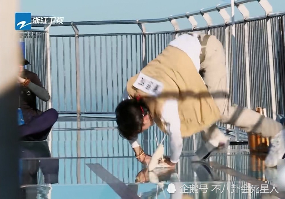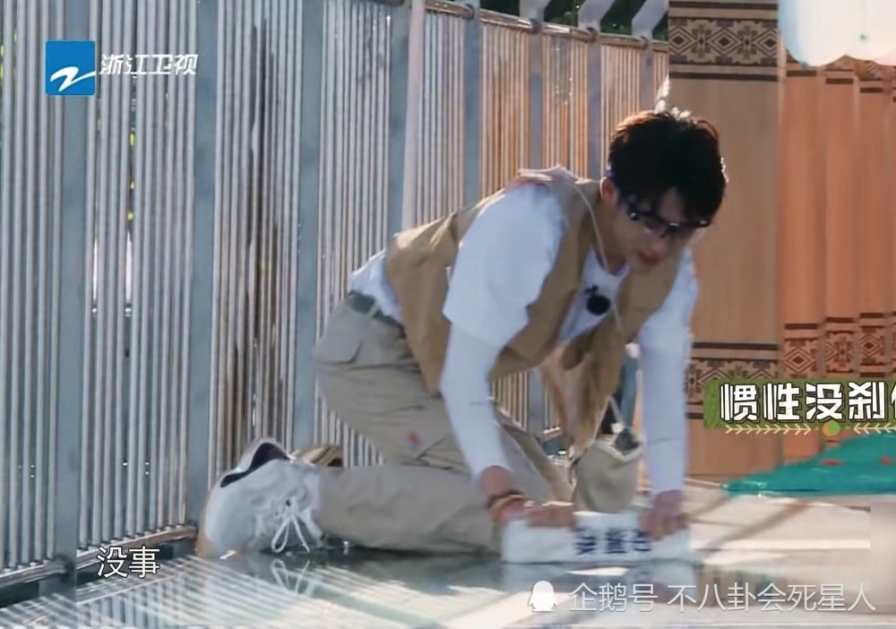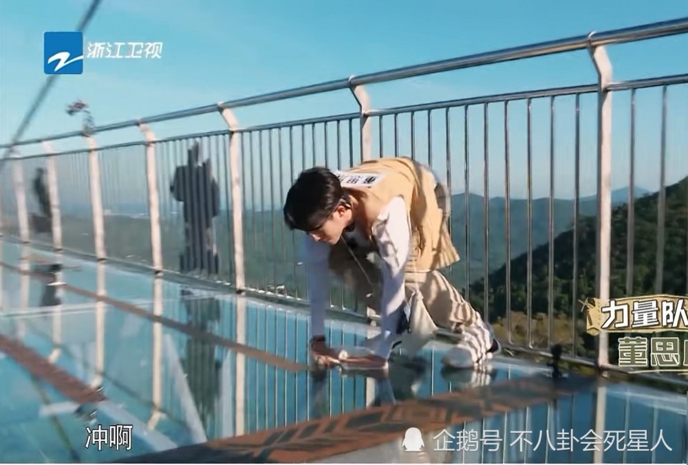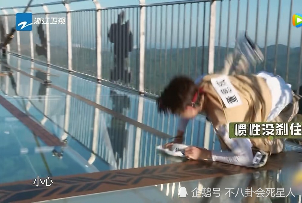 在这个游戏中,嘉宾们需要用接力的方式,弯着腰用毛巾在玻璃栈道上擦拭几个回合,而且还要比拼速度,所以轮到董思成的时候,他非常卖力,鼓着劲头往前冲,但是却因为玻璃地面太滑,速度太快,没刹住,直接摔倒了栈道上面。