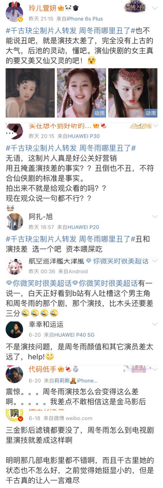 有的网友觉得是片方重金请周冬雨才来的,也有网友说是周冬雨想和鹅搞好关系,总之,大多数的网友觉得周冬雨是因为利益关系才接这部戏的。现在《千古玦尘》有点扑街 ,周冬雨口碑下滑,希望她之后好好的投身于电影事业,不然真的要把路人缘给败没了。