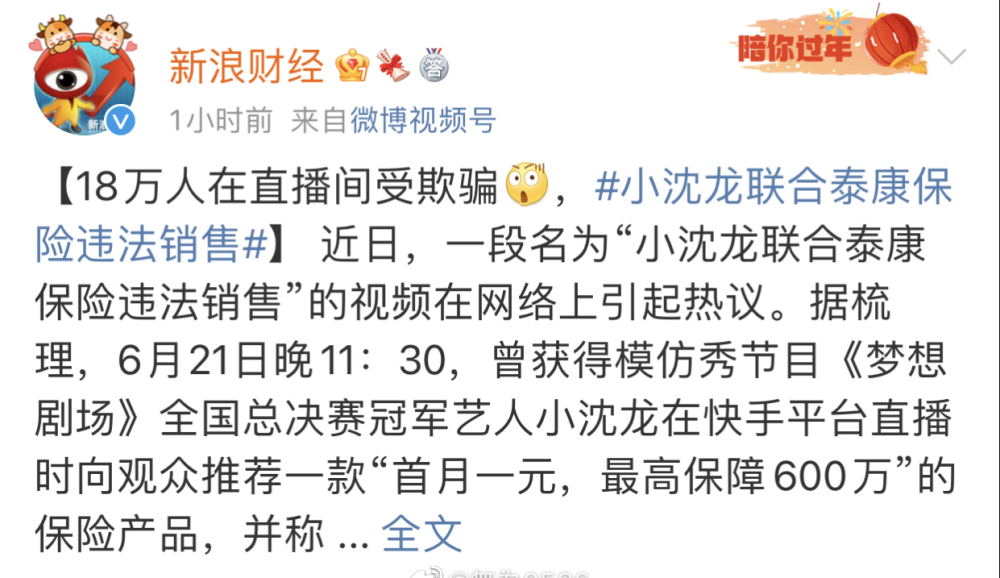 而保险这个环节,小沈龙在直播间联合泰康保险推出的是“首月1元,保额600万”,大家都知道保险是必须要有从业资格证,而且保监会官方曾明文下过红头文件,首月1元保险就是欺诈行为,小沈龙这是知法犯法。