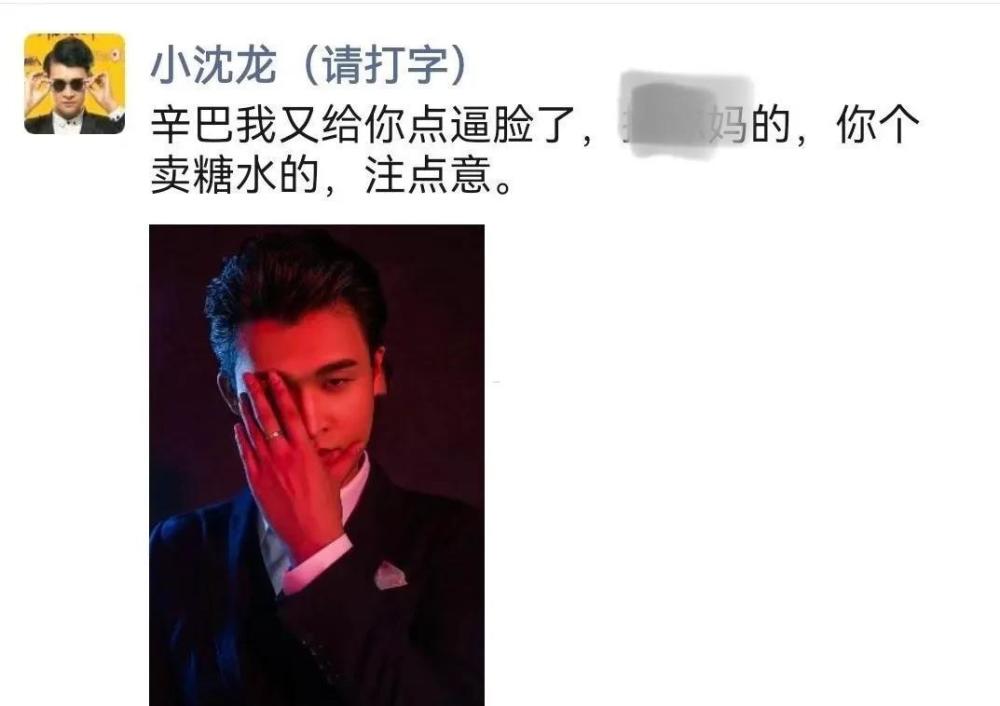 这件事被小沈龙知道后,小沈龙直接在朋友圈发了一张大骂辛巴的图,并且讽刺“辛巴是个卖糖水的”,其实除了和辛巴对骂之外,不少网友还反映小沈龙经常在直播间多次跟电商演戏坑粉丝,为了钱不择手段,爆粗口,辱骂他人父母!