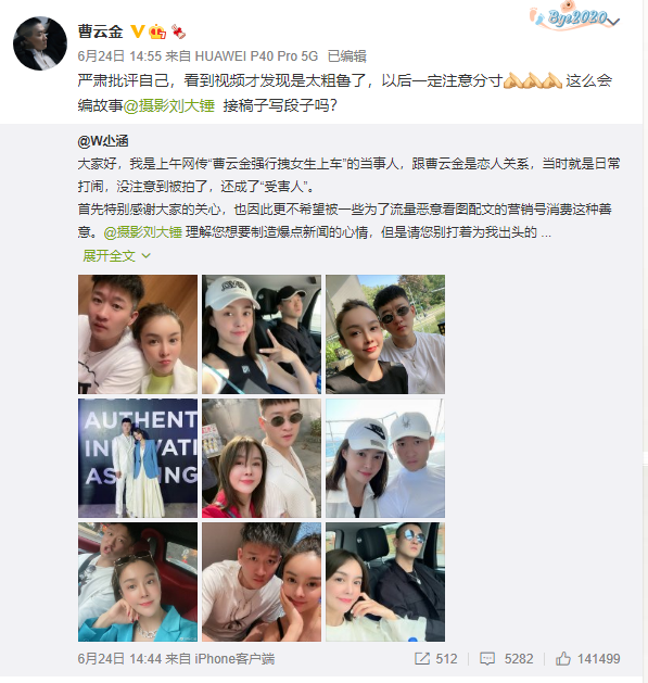 随后曹云金也转发了女方的微博,进行了自我检讨。