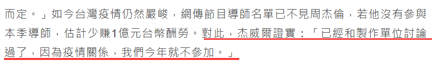 据台媒最新报道,中国台湾5月疫情爆发,当时就有台媒询问周杰伦是否还会参与本季《好声音》,由周董创办的杰威尔公司方面曾语带保留回应“视疫情情况而定”。当前台湾疫情形势依旧严峻复杂,台媒更曝出节目导师名单已不见周杰伦,并获取到杰威尔方面的证实“已经和制作单位讨论过了,因为疫情关系,我们今年就不参加。”