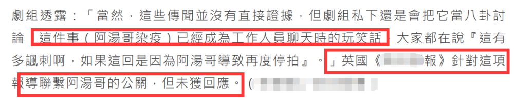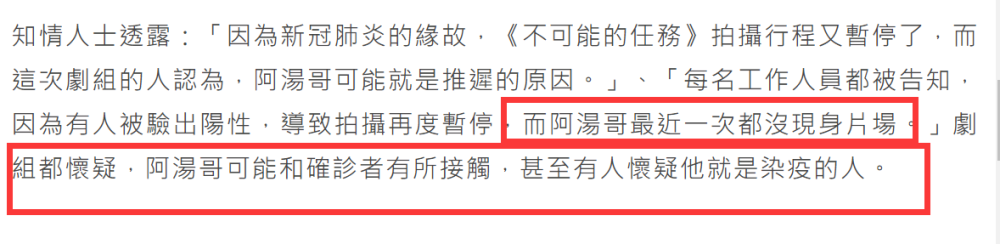 6月26日,据台媒报道称,本月14日好不容易复工的剧组,再度被传出有人新冠检测为阳性的消息,由于阿汤哥本尊近段时间以来迟迟没有露面,部分人开始猜测感染新冠的人疑似为阿汤哥,顿时引来外界热议,也让全球影迷颇为关注。