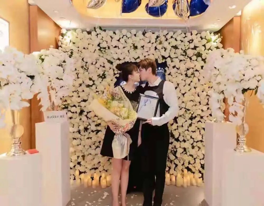 球球的男友则穿着黑色西裤搭配白衬衣,留着棕色短发侧颜很抗打。求婚现场用浅色的玫瑰花打造了花墙,中间还镶嵌了一个满是皇冠的展柜,屋顶上则挂满了气球,场景十分浪漫。