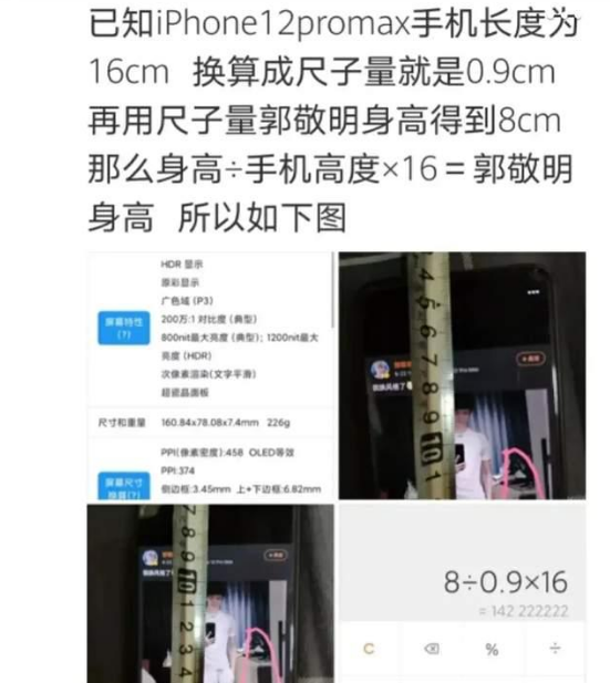 也有网友用数学公式,将手机尺寸等比例缩小,然后用尺子去测量,得出郭敬明的身高大约“140cm”。