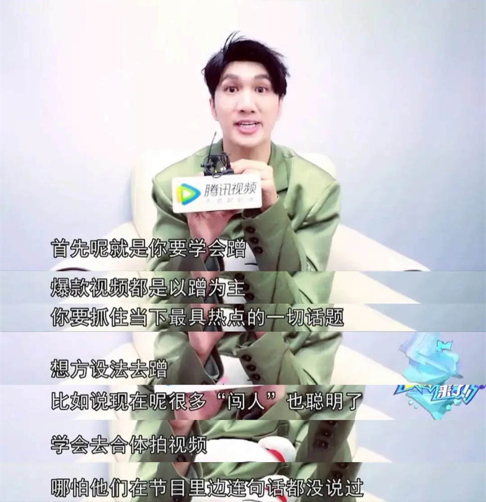 他还表示:“节目里跟你玩得最好的那个人,可能明天就是抢你代言的人”、“爆款视频主要靠蹭,现在很多学员都在合体拍视频”。