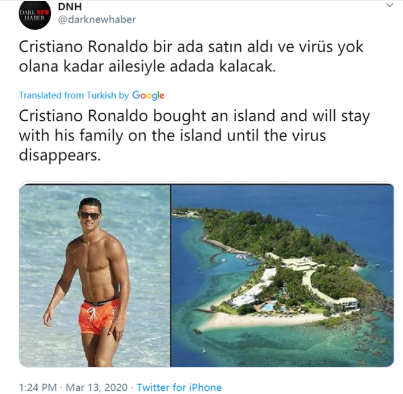 为了避免传染,媒体指他去了一个小岛隔离,并称那个与世隔绝的小岛就是C罗产业。