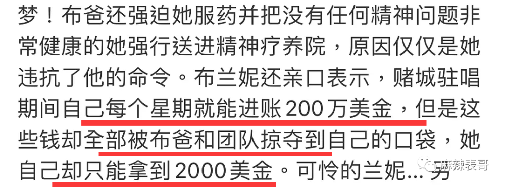 还有2012年,父亲强迫她去参加某节目,每天给布兰妮灌药,布兰妮反抗后就用绳子捆绑她的双脚。