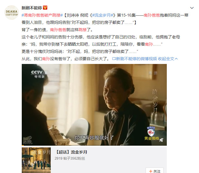 《流金岁月》里他因炒股失利欠下巨额债务,最终跳楼自杀的情节,还一度登上了微博热搜。