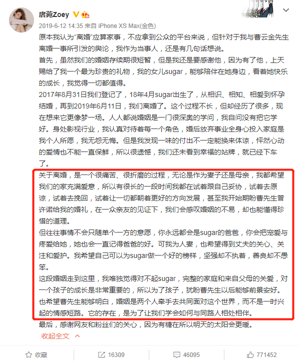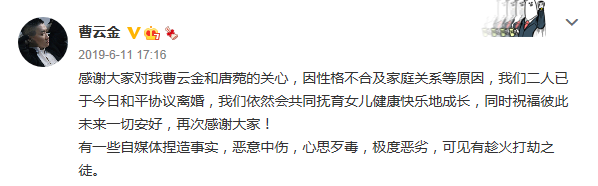 相比曹云金的寥寥数语,还要顺手内涵一波网友和自媒体的离婚声明,唐菀这边的信息就要丰富也真挚很多了。