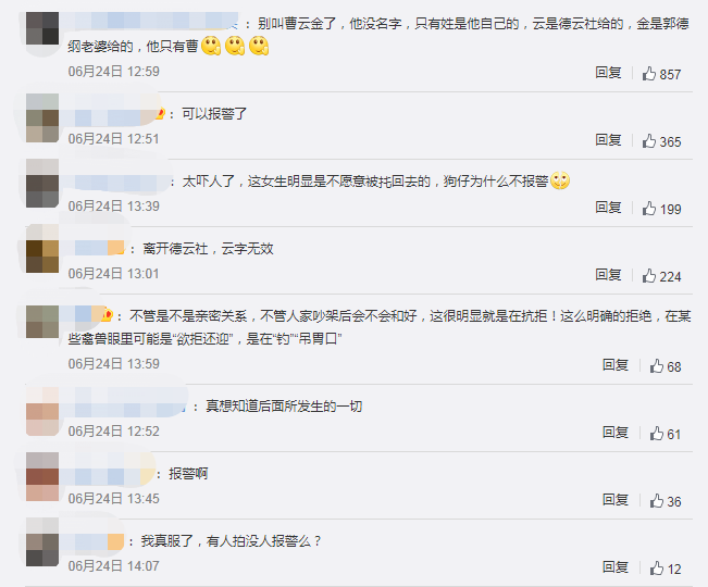 网友们除了在说曹云金早就不配用德云社给他的“云”字了,勿cue。其他的主要就是表示不管人家俩认识不认识,黑衣女生明显不愿意跟他走,都已经到这程度了居然还没人报警吗??
