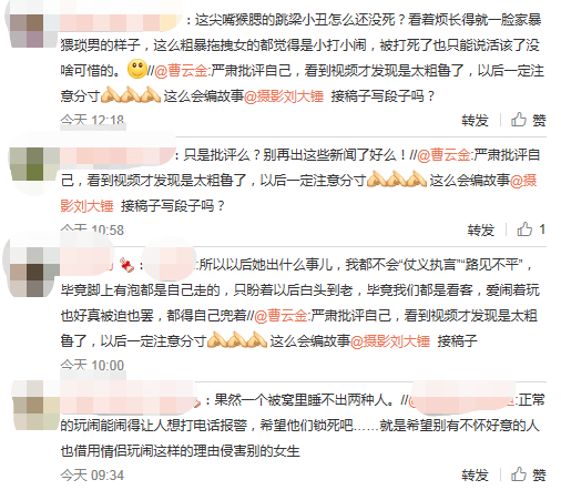 假设不是故意摆拍炒作,她被曹云金这么粗暴地对待还觉得是情侣小打小闹,那她以后要是被渣男打死了也就自己兜着吧,没有人会再去为她仗义执言了。