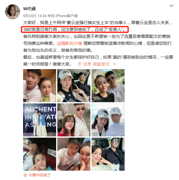 她说她当时和曹云金就是日常打闹,没注意被拍了,还成了“受害人”,希望狗仔不要打着为她出头的名义,做着伤害她的事。也希望每个女生要是真的遇到被胁迫的情况,一定要第一时间报警。