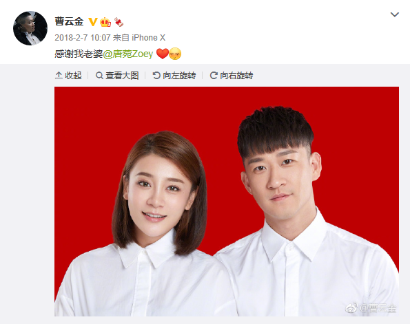 2018年2月7日,曹云金和唐菀晒出了结婚照,官宣了结婚的消息。虽然是闪婚,但也是勉强给了网友们一种浪子终于落定的错觉。
