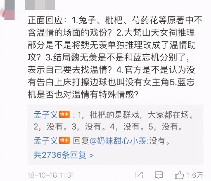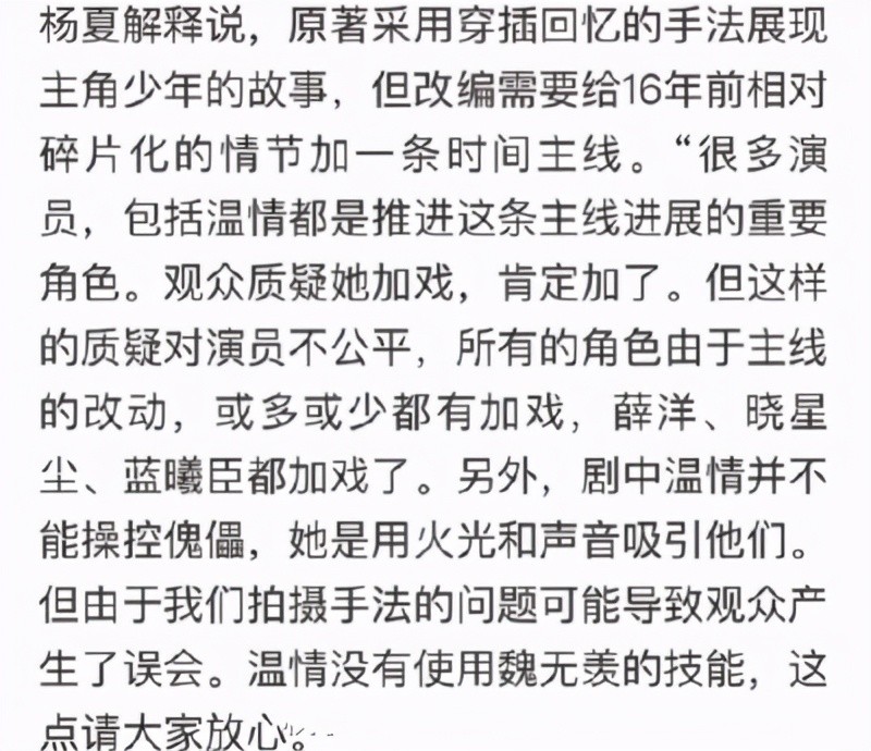 比如,粉丝说孟子义擅自加戏加成大女主,陈情令差点就变成男一女一戏了,多亏粉丝们强烈抵制才把戏保了下来;