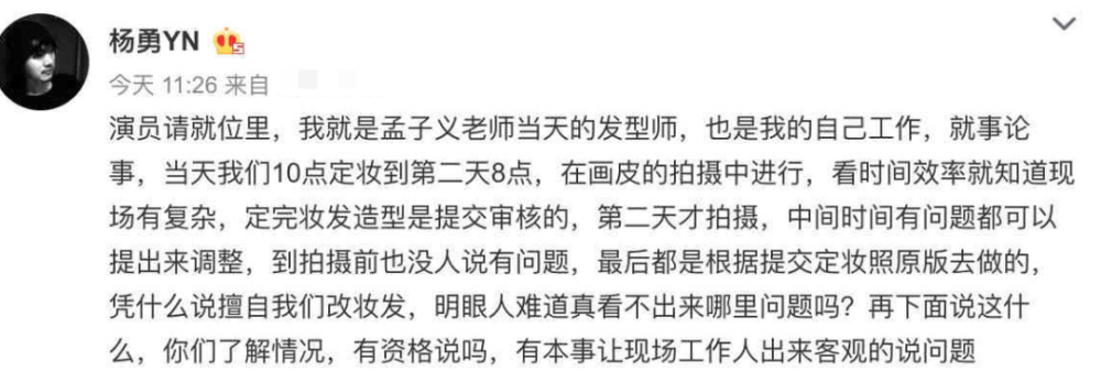 当时并没有不按定妆卡上妆,而且妆面“到拍摄之前也没人说有问题”,不应该被突然扣上个擅自改妆发的帽子。