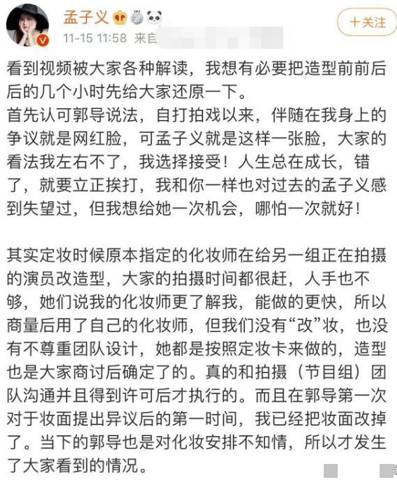 事后孟子义出面解释说,是因为拍摄太赶,原本的化妆师被分去了郭敬明执教的另一组,所以权衡之后节目组让孟子义用了自己的化妆师,一切妆容也都是按照定妆卡来操作的。