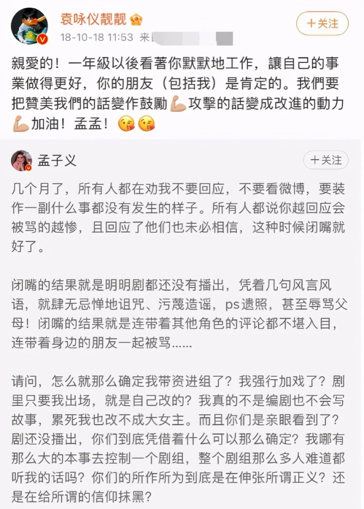 值得一提的是,袁咏仪事后和孟子义保持着不错的关系,在她18年被网暴时,还站出来为孟子义说话: