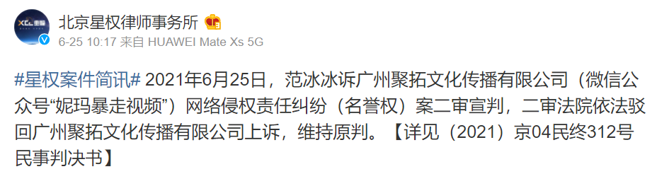 6月25日,范冰冰的律师在社交平台上发文,透露范冰冰的名誉权官司二审已经胜诉。