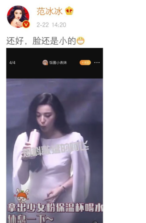 对此范冰冰幽默回应称还好自己的脸是小的,侧面澄清自己不是怀孕只是长胖。