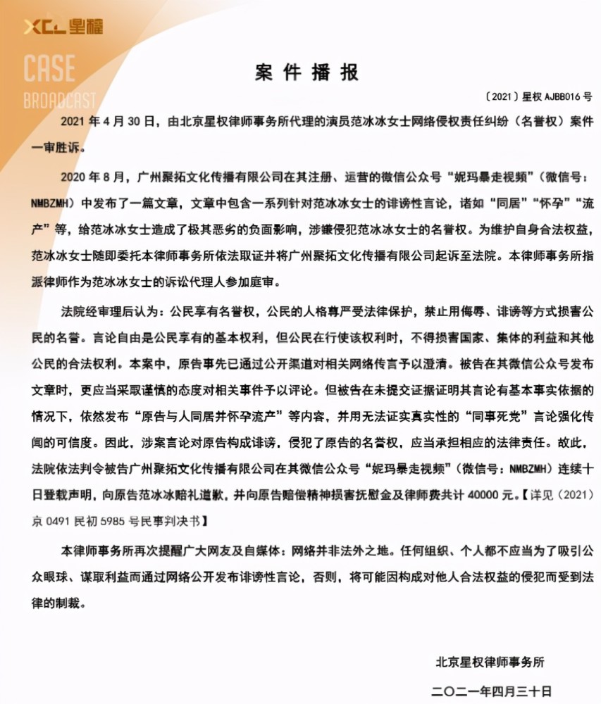 据悉,被告在没有证据的情况下,曾发文诽谤范冰冰和他人同居还怀孕流产,侵犯了她的名誉权,在一审时被法院判决连续十日公开道歉,并赔偿范冰冰精神损害抚慰金和律师费共计4万元。