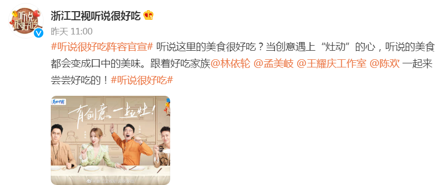 近日,小编从网上获知了一个消息,浙江卫视又出了新综艺了,这一综艺叫做《听说很好吃》,光听名字就很好玩,感觉是一个适合吃货们看的节目。在6月25日,《听说很好吃》正式官宣了,并且宣布了嘉宾阵容,小伙伴们有关注吗?