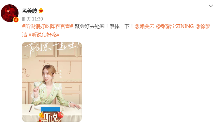 在25日节目进行官宣的时候,孟美岐也对这一节目进行了一个官宣,她晒出了节目海报,并且写道:聚会好去处有!趴体一下!并且艾特了赖美云,张紫宁跟徐梦洁。