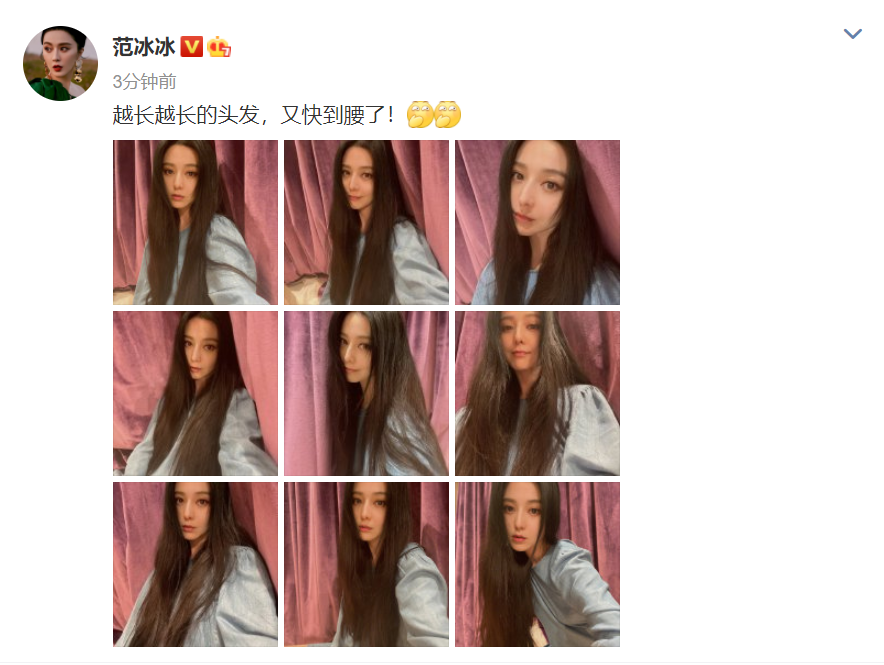 6月26日晚,范冰冰在网上晒出一组九宫格自拍,并配文写道:“越长越长的头发,又快到我腰了!”照片中,范冰冰坐在窗帘前开启自拍臭美模式,一头及腰黑长直发,这才是真正的发量王者,40岁的范冰冰依旧仙气十足,这颜值这状态完全就是个青春美少女。