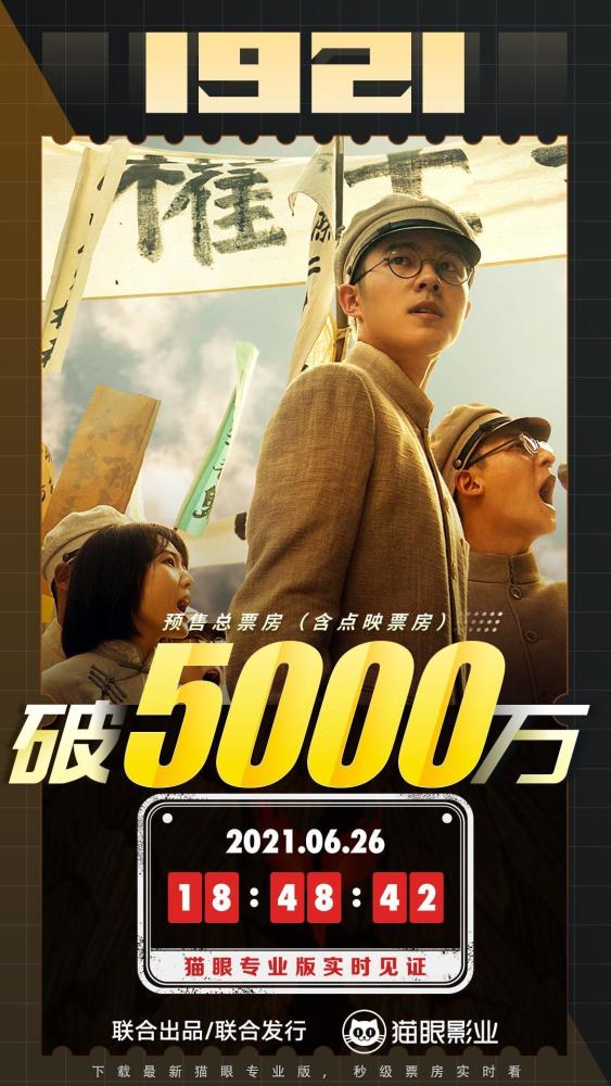 据@猫眼专业版 微博消息,6月26日18:48:42,《1921》总票房(含点映)破5000万元。