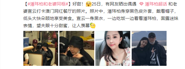 话说回来,潘玮柏对妻子是真爱,两人不止一次线下约会被发现。在今年四月份,网友晒出偶遇二人的照片,并透露夫妻俩打卡网红餐厅,当真好雅兴。