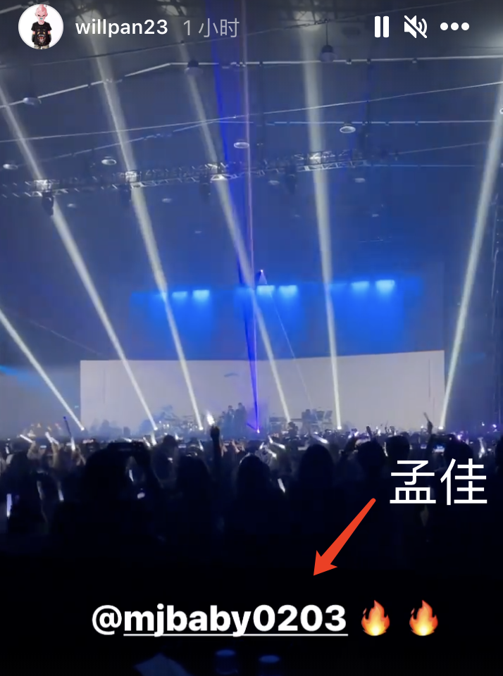 随后,潘帅晒出疑似演唱会的短视频,并cue了孟佳的社交账号。不用猜也知道,这是去支持小迷妹孟佳的演唱会了。