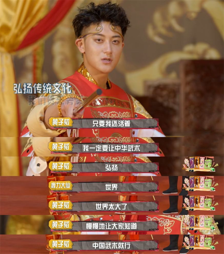 章金莱对黄子韬说要弘扬经典文学和经典武术,黄子韬说:放心吧老师,只要我还活着,我一定让中华武术,弘扬...。话还没说完旁边的人说:弘扬世界。黄子韬说世界太大了,慢慢的让大家知道中华武术就行了。