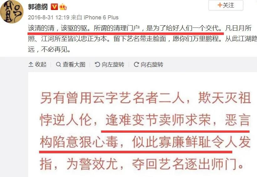 郭德纲做到这步,算是仁至义尽了,可曹云金并没有因此放过曾经的恩师,最终郭德纲忍无可忍,宣布将曹云金逐出师门,并且收回“云”字。