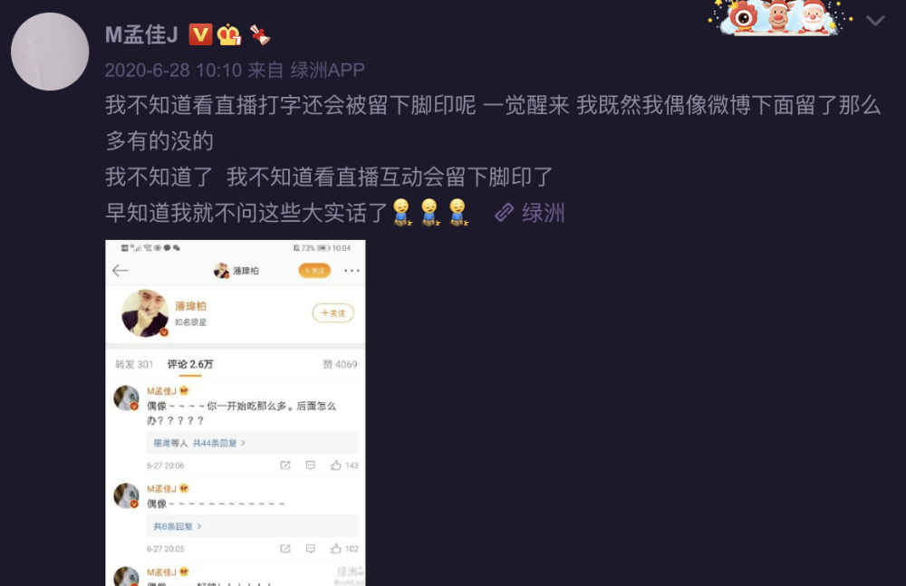 去年潘玮柏直播,孟佳就疯狂发言,但她不知道互动就等于留言,说了很多大实话,比如“你一开始吃那么多,后面怎么办”、“你是不是没洗头呢”……