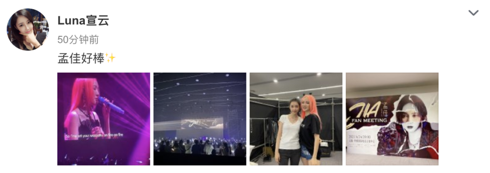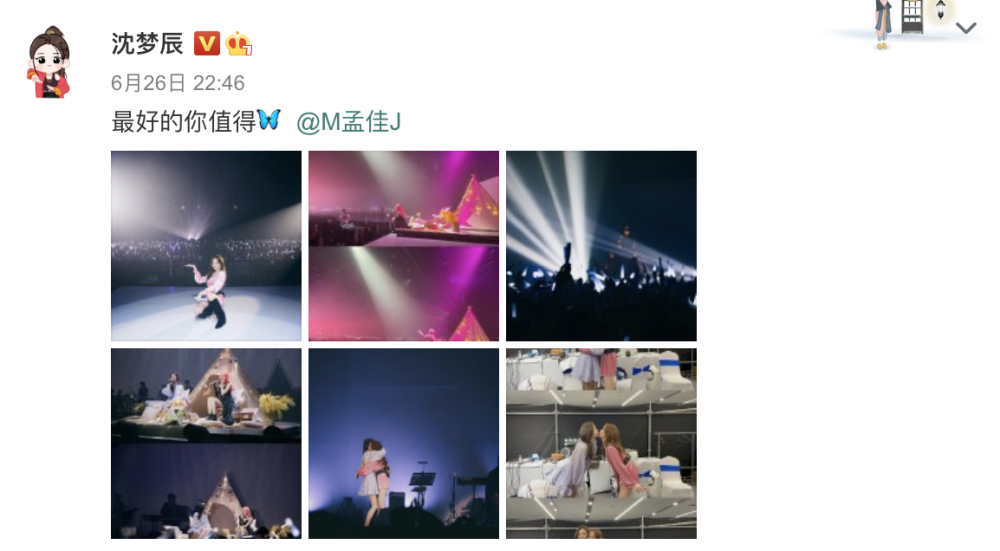 另外,沈梦辰也来到了现场为孟佳加油打call,并且分享了现场高清图以及后台拥抱的照片。