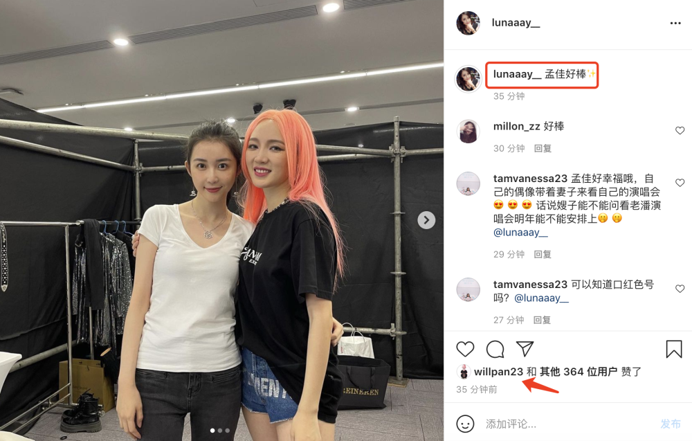 稍晚一些时候,宣云也分享了和孟佳的合影,直呼“孟佳好棒”,像个小迷妹。孟佳还没来得及回应,潘帅就已经先来点了个赞,细节可以看出他是个老婆奴!