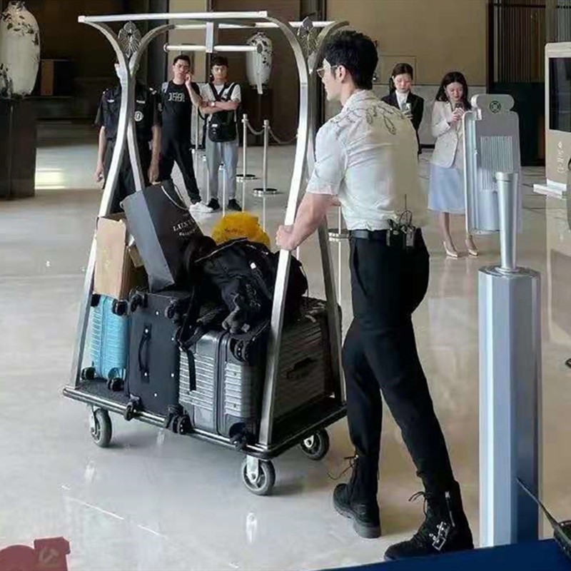 黄晓明在现场是比较勤劳的一个,到了之后就是忙忙碌碌,一会周也到场之后,黄晓明又推来了行李车,帮助几个嘉宾搬运行李,一车上拖着很多的行李,也都是由他自己来完成的。