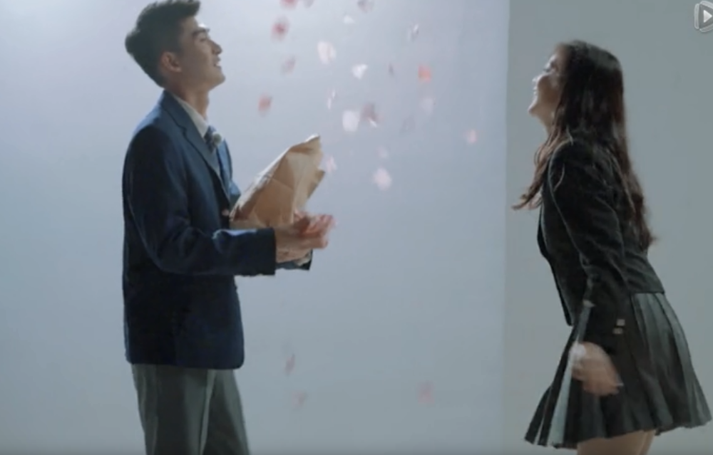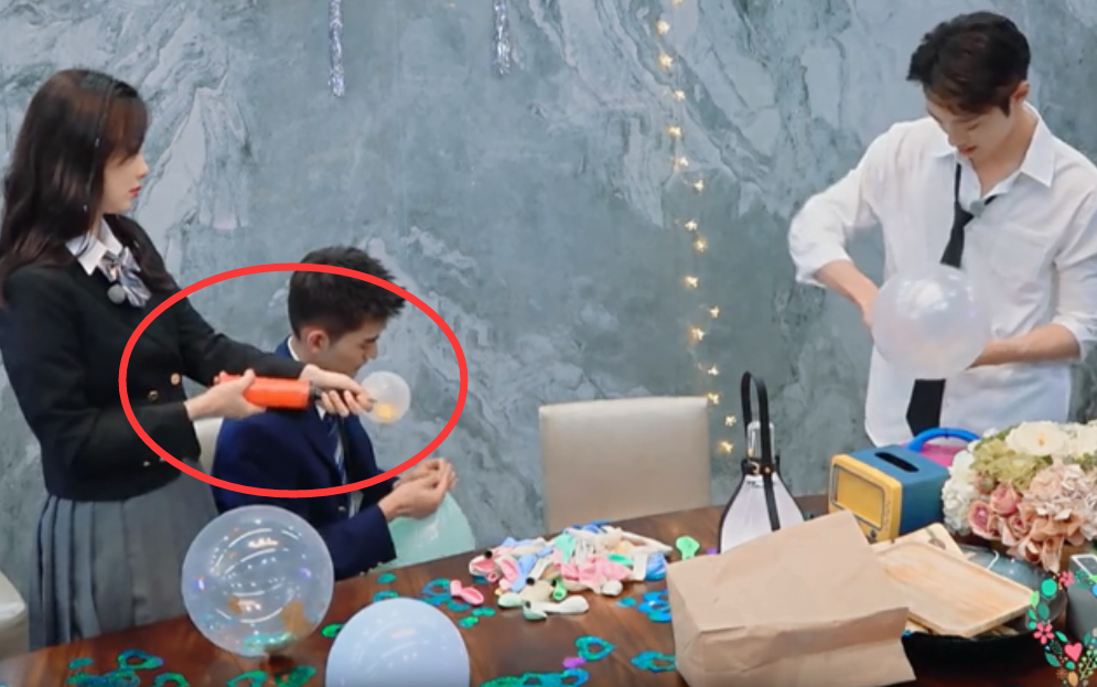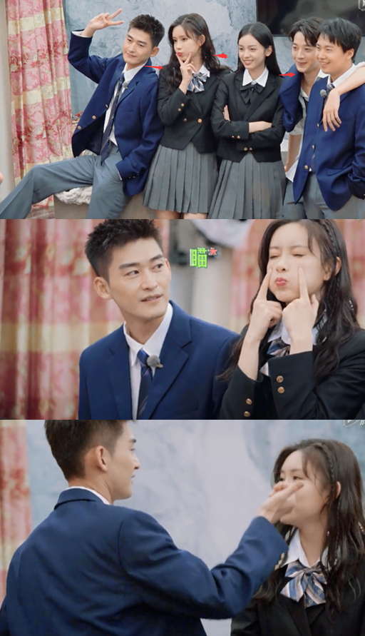 孟子义跟张翰穿的是类似款搭配的女装学生服,两人在布置场景撒花的时候,张翰和孟子义的互动如同拍摄浪漫偶像剧。