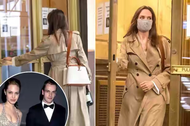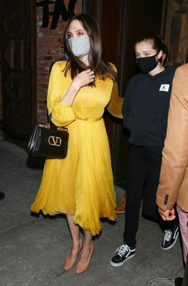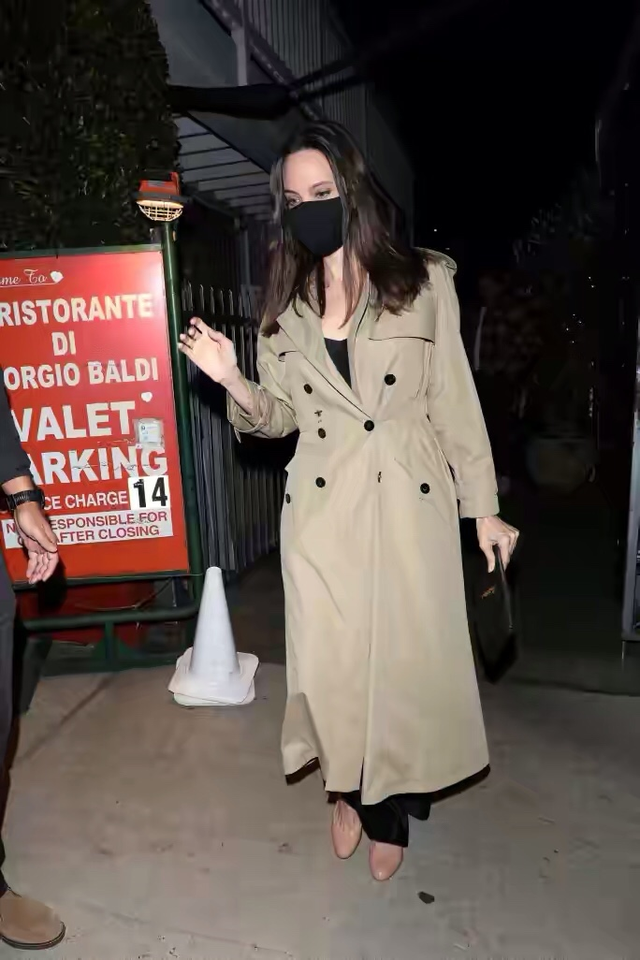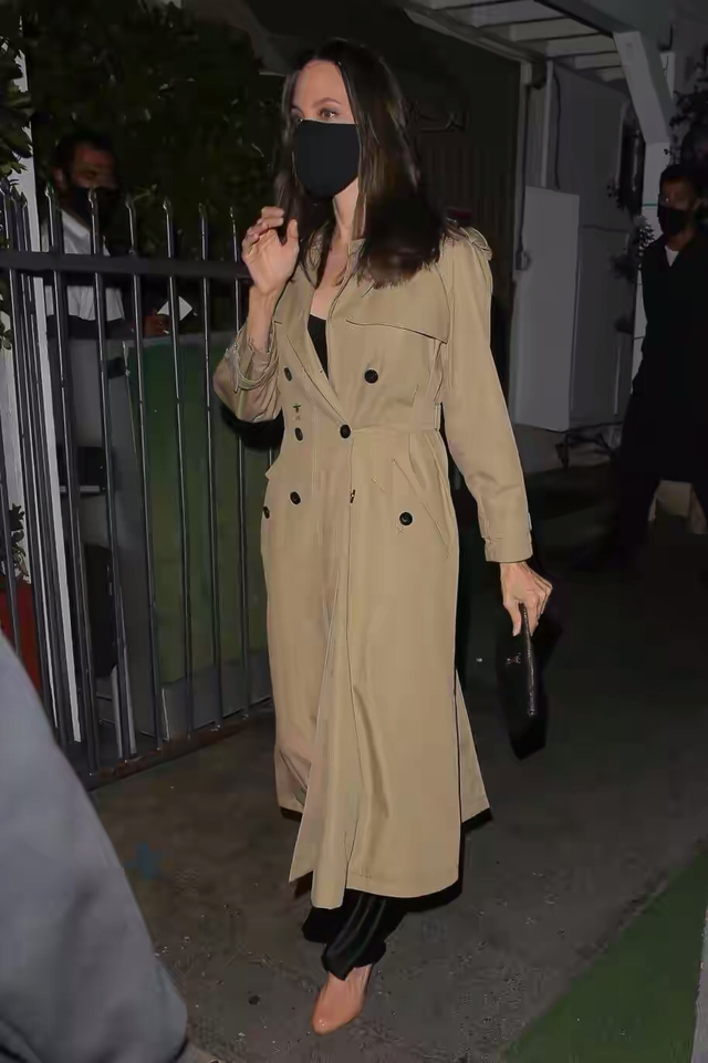 从曝出的照片中可以看出,朱莉当天身穿一件卡其色的长款风衣,内搭黑色缎面连衣裙,脚上还穿着一双裸粉色的高跟鞋,打扮得十分优雅。