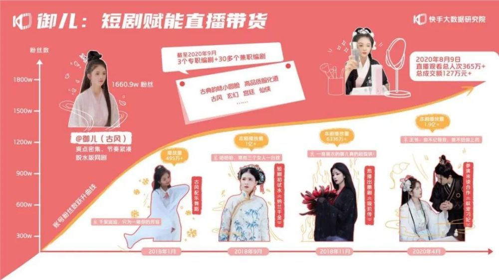 而电商,是随着去年直播带货飞速发展之后起来的新模式。一些从爆款微短剧当中成功被大众记住的演员,成功将自身个人IP带到直播间,进行带货转化。如快手的“古风一姐”御儿,三年内主演了近十部微短剧,根据《2020快手短剧生态报告》显示,其直播单场最高成交额达到了127万多元。