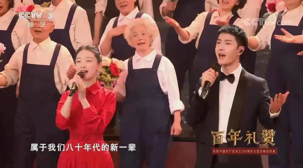 随着《年轻的朋友来相会》的音乐声响起,两位90后艺人周冬雨和王一博,连同清华大学的教师们一起登上舞台,用青春的歌声礼赞百年。