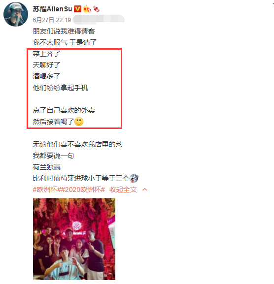 近日,苏醒在自己的社交平台上晒出了朋友聚餐的照片,其中有好友何洁、沈凌、姜潮麦迪娜夫妻和绯闻女友廖语辰。并且还配上了幽默的话语:“难得请客,朋友们点外卖”,看来对他段子手的称呼真的不是白叫的。不过在曾经和夏航燕李炜事件之后,苏醒就已经低调了很多,大家对于他的近况也是在他参加《追光吧!哥哥》那时。
